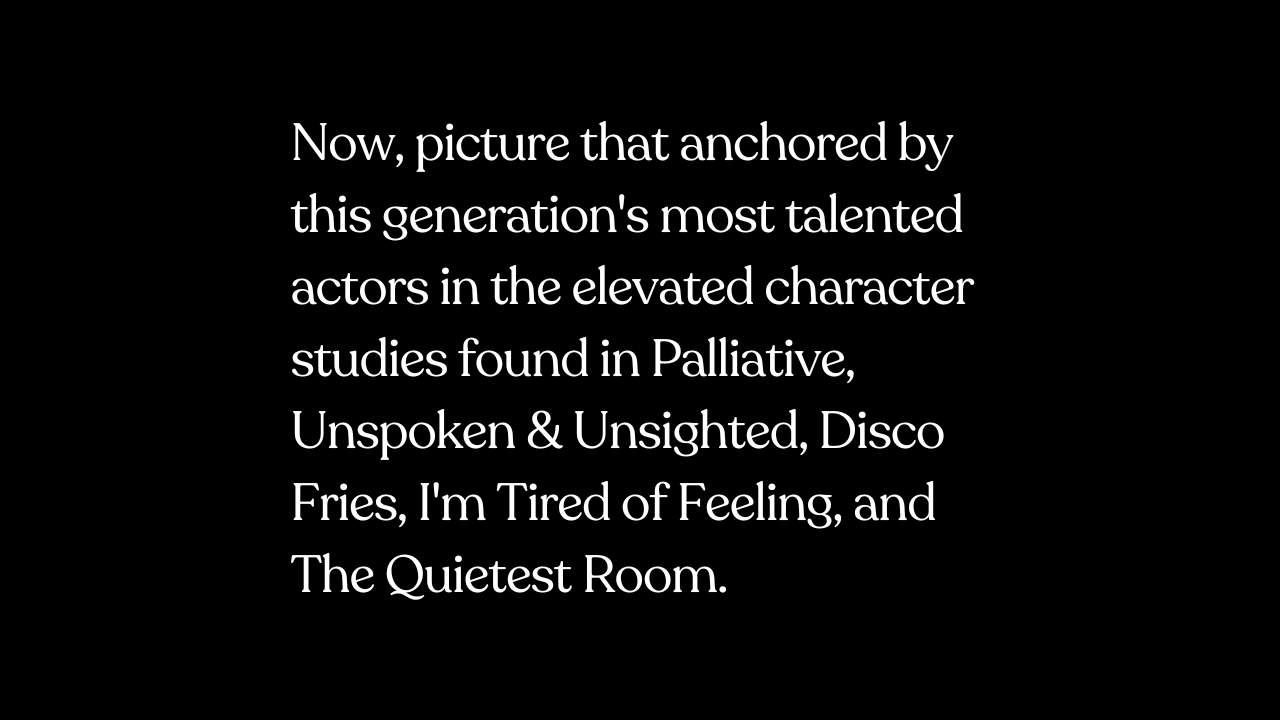 To establish this interconnected world long before we go to camera, we will host a world-building table read—happening either three days in a row or planned throughout the course of a few weeks to fit everyone's schedule. To mimic the planned double-feature theatrical release, Day One will feature readings of Palliative and Unsighted and Unspoken, separated by a comfortable intermission to rest and recalibrate. Day Two will cover Disco Fries and I'm Tired of Feeling, following that same double-feature and intermission structure. Day Three will culminate with our finale, The Quietest Room.
