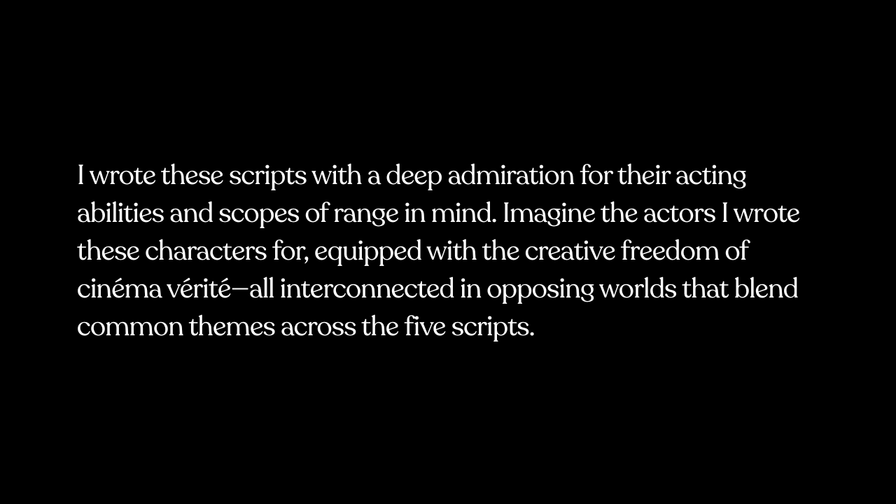 Ultimately, these interconnected films are crafted to bring what I hope to be a collective exhale and universal empathy, garnered through our shared humanity. This will all be made possible by the amazing cast, crew, producers, and studios who take a chance investing in an unknown multi-hyphenate artist—someone whose greatest desire is to witness the study of recognizable human behavior in elevated circumstances, brought to life by the very artists who have inspired her from the first moment she looked at a movie screen.