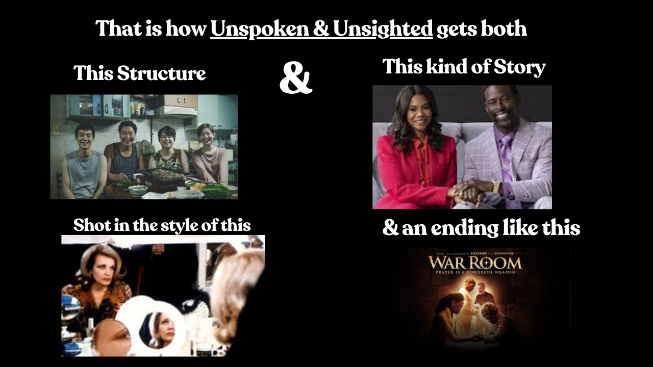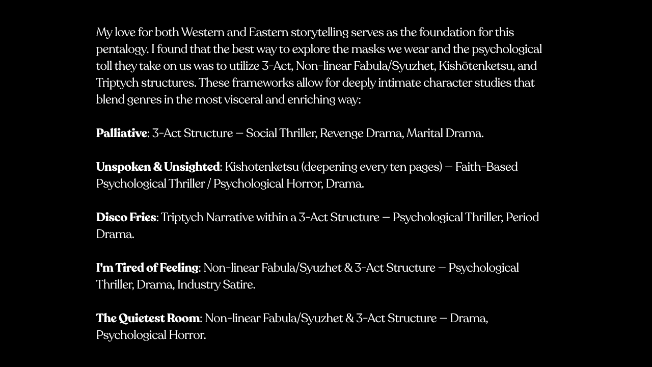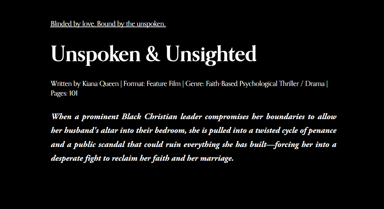 At its core, this pentalogy is a deep character study of women navigating layered narratives—an exploration of the masks we wear and the psychological toll they take on us. I found that the best way to explore those emotional complexities was by merging my love for both Western and Eastern storytelling—utilizing 3-Act, Non-linear Fabula/Syuzhet, Kishōtenketsu, and Triptych narrative structures. By blending these frameworks, the pentalogy delivers emotionally resonant, genre-blending character studies that center complex Black women and men, supported by rich, dynamic ensembles. Grounded in my roots, the entire slate is designed to be filmed almost exclusively against the backdrop of New Jersey. The sole exception is a brief, vital trip to Abuja, Nigeria, to capture the awe-inspiring 100,000-capacity Glory Dome at the Dunamis International Gospel Centre for Unspoken and Unsighted. While each script stands alone, they share complementary themes and build upon one another to create a cinematic event that begins first with the raw exploration of human behavior by our actors. To bring healing and wholeness to a generation that endures trauma and depression like never before, these scripts all subtly weave in the comfort that brought me through my own dark seasons—that is, Christ.