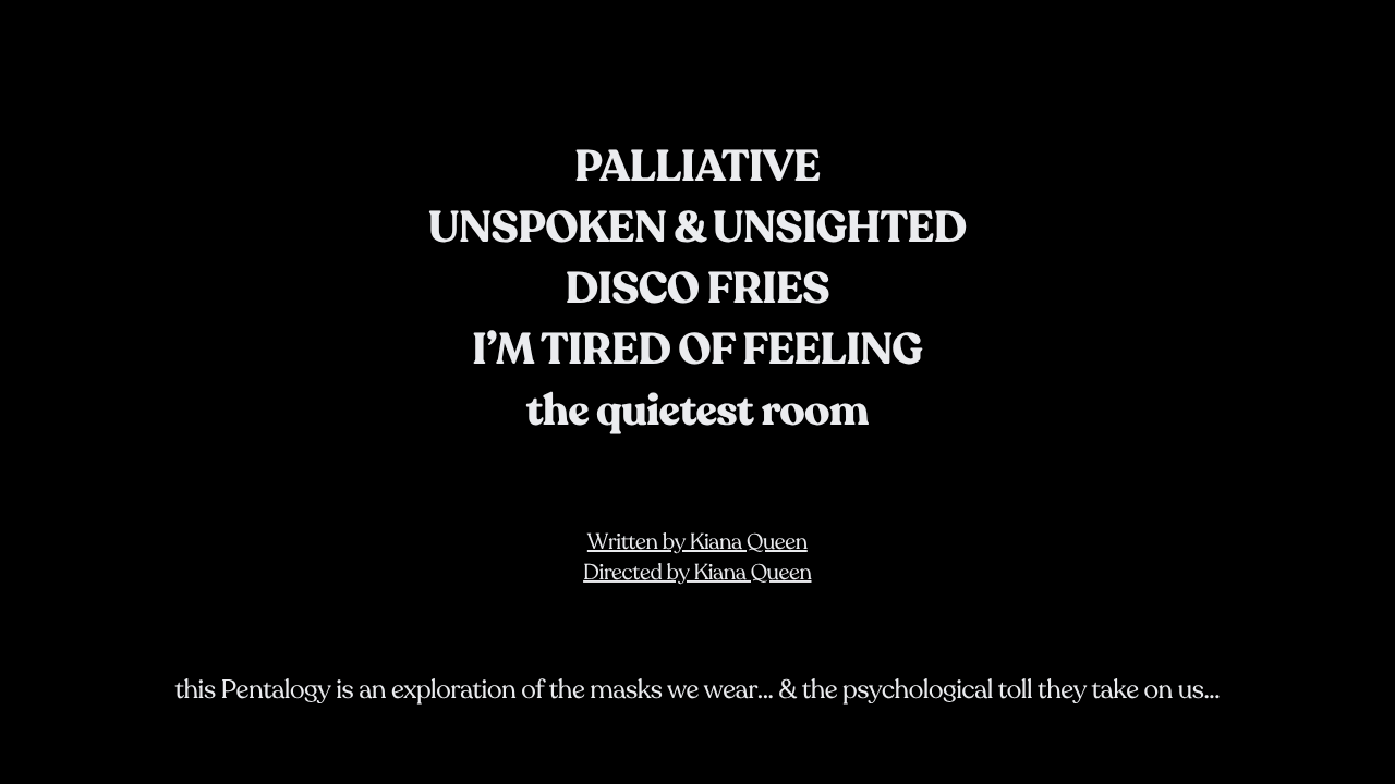 To avoid placing too heavy a labor burden on the crew throughout this pentalogy, we will be working with two to three amazing Directors of Photography. One will focus on the bold visual contrast of Disco Fries and Palliative, while another will lens the raw intimacy of The Quietest Room, I'm Tired of Feeling, and Unspoken & Unsighted. I look forward to working with amazing artists who specialize in the technicality of beautifully lighting Black people, mastering visual contrast with shadows, and who have the heart to truly care for the emotional intent of the scenes. Logistically, this also allows us to be highly efficient—while we are shooting one production, another DP can be actively preparing for the next. Any and all suggestions are welcomed on set. I look forward to working with every department that brings life and depth to a story.