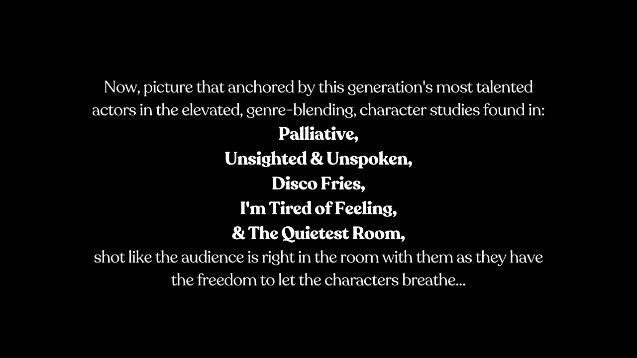 The vision culminates in a groundbreaking theatrical event spanning a single month, partnering with movie theaters to release two discounted double features every other week (Palliative paired with Unspoken and Unsighted, followed by Disco Fries paired with I'm Tired of Feeling), wrapping up with a single-feature release of The Quietest Room. This ambitious, rapid-fire release strategy is designed to leave a massive and lasting impact on cinema and on the hearts of audiences around the world.